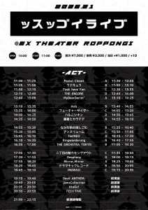 出演|AsIs/THE ENCORE/アンスリューム/INUWASI/UtaGe!/衛星とカラテア/THE ORCHESTRA TOKYO//Jams Collection/Task have Fun/Devil ANTHEM./ドラマチックレコード/なみだ色の消しごむ/Pastel Closet/ハルニシオン/FES☆TIVE/feelNEO/フューチャーサイダー/MyDearDarlin’/Mirror,Mirror/ラナキュラ/Ringwanderung/Onephony/二丁目の魁カミングアウト